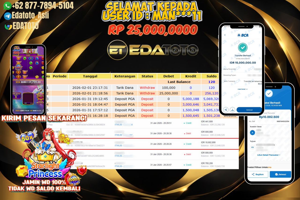 Selamat Kepada Pemilik user ID : MAN***11 Hari/Tanggal :MINGGU/ 1 februari 2026 Jackpot : Rp. 25000,000 JT Withdraw : 25000,000 . . .