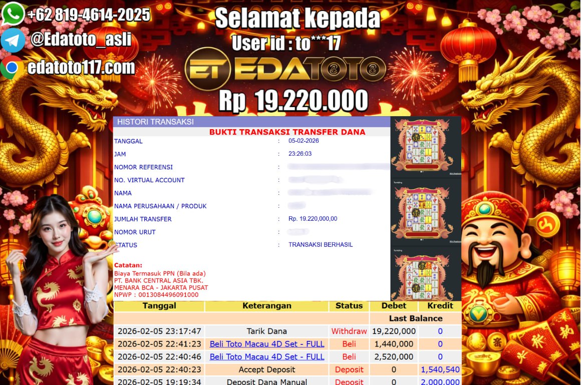 Selamat Kepada Pemilik user ID : to***17 Hari/Tanggal :Kamis/ 05 februari 2026 Jackpot : Rp. 19,220,000 JT Withdraw : 19,220,000 . . .