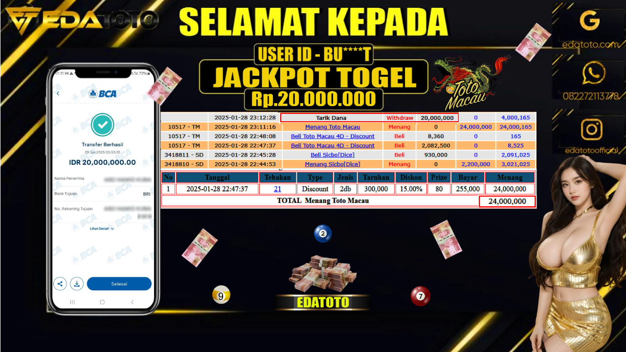 Selamat Kepada Pemilik user ID :BU****T Hari/Tanggal : Kamis/ 30 , JANUARY 2025 Jackpot : Rp. 20.000.000 JT Permainan : . . .