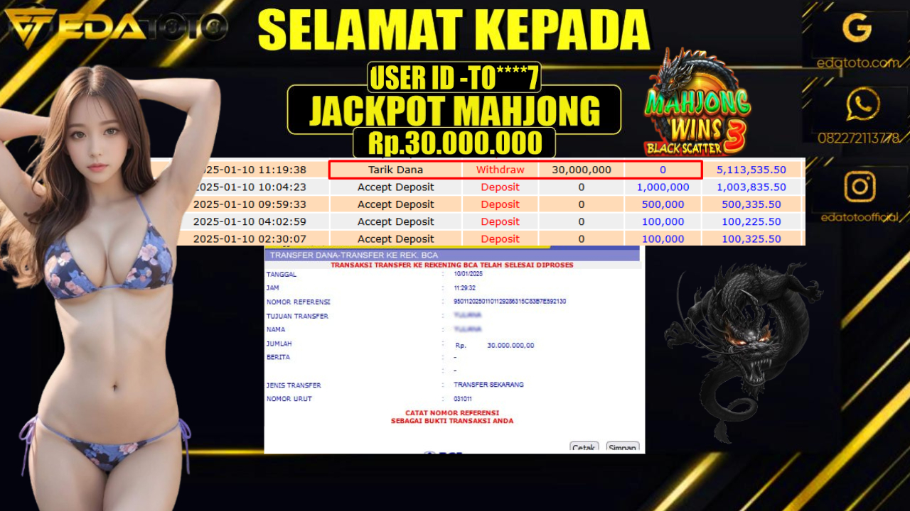 Selamat Kepada Pemilik user ID : TO****7 Hari/Tanggal : SABTU/ 11 , JANUARY 2025 Jackpot : Rp. 30.000.000 JT Permainan . . .