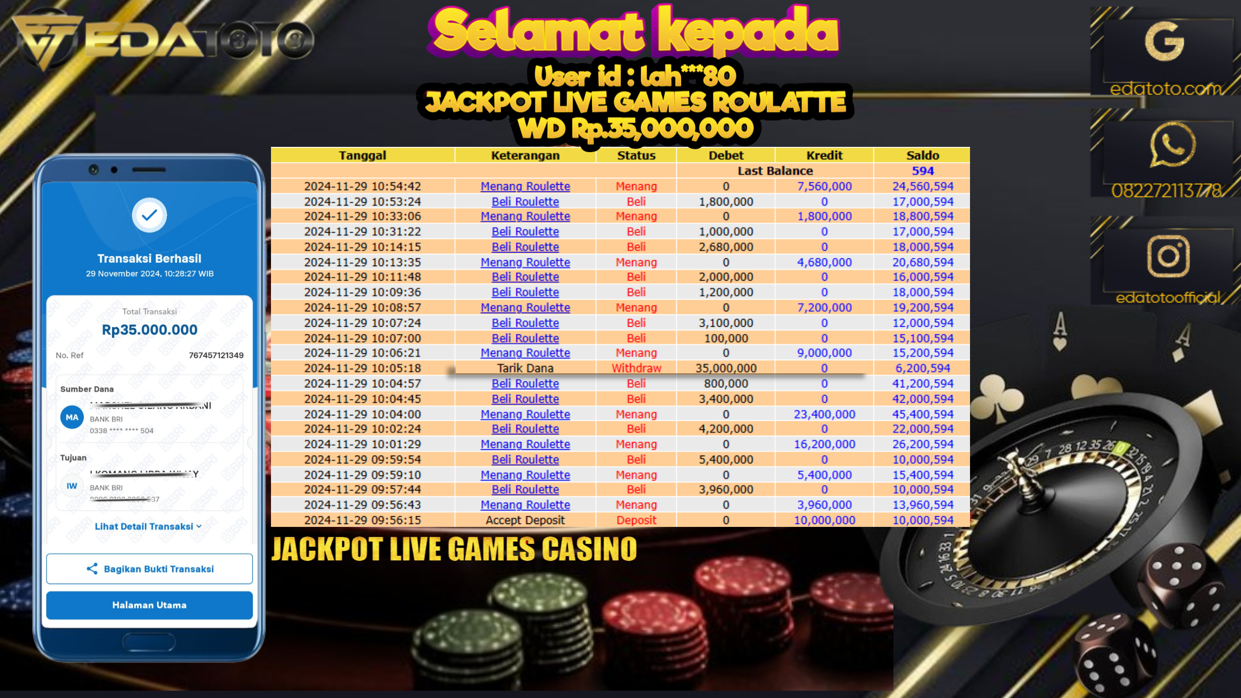 Selamat Kepada Pemilik user ID : lah***80 Hari/Tanggal : Jumat/ 29 NOVEMBER 2024 Jackpot : Rp. 35.000.000 JT Permainan : . . .