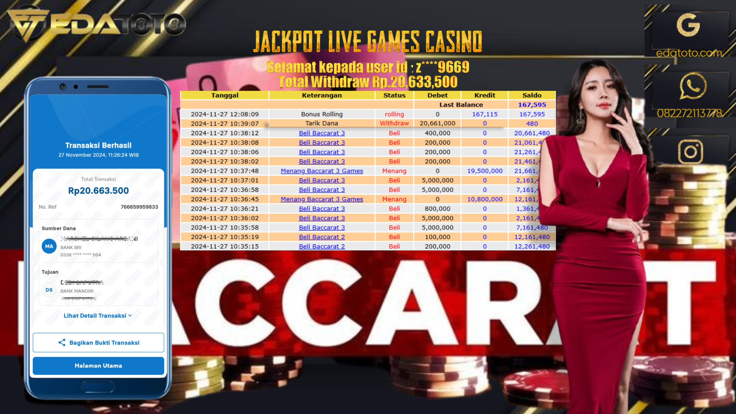 Selamat Kepada Pemilik user ID : z****9669 Hari/Tanggal : Jumat/ 27 NOVEMBER 2024 Jackpot : Rp. 20.663.500 JT ( biaya . . .