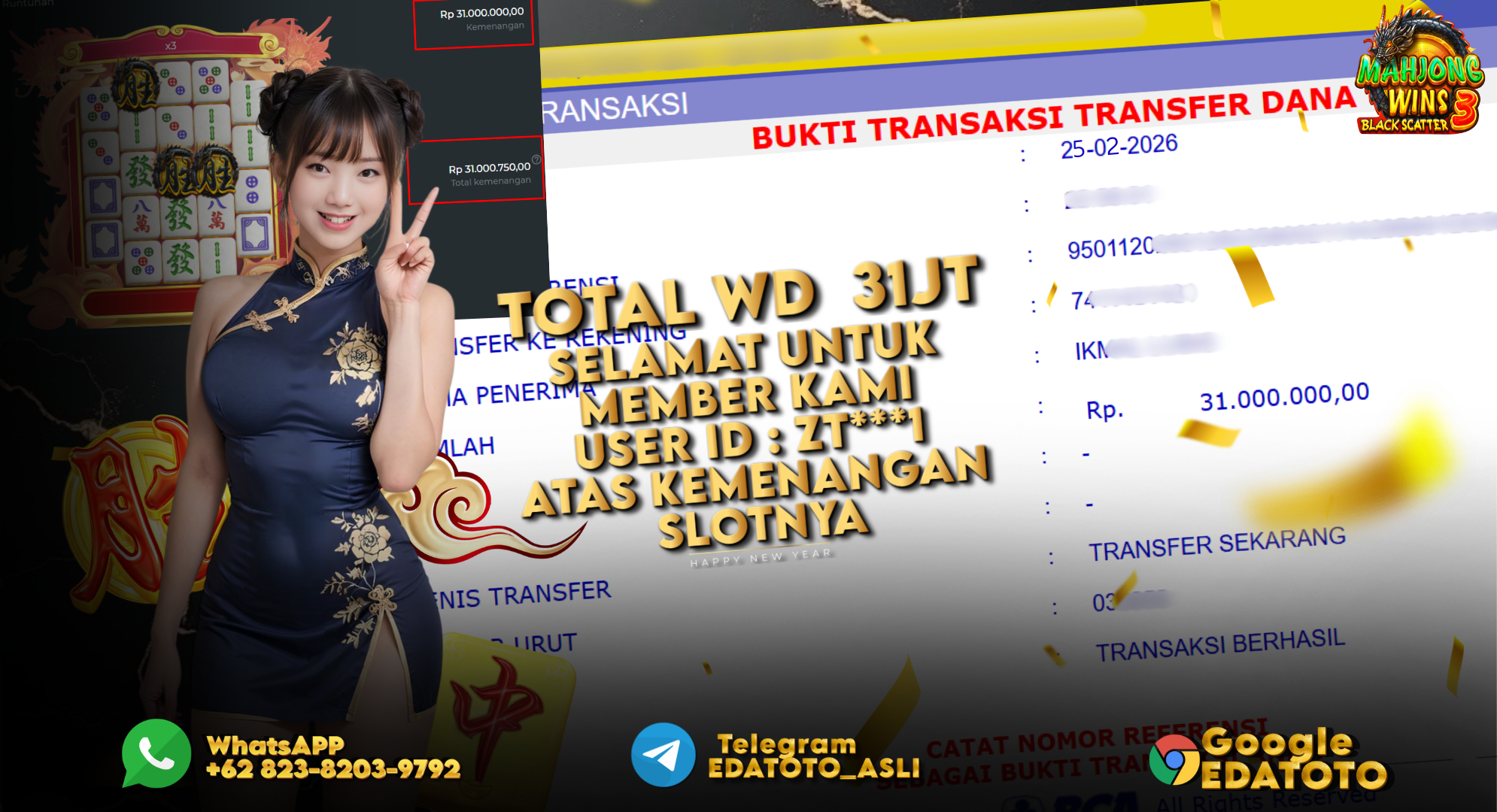 Selamat Kepada Pemilik user ID : ZT***1 Hari/Tanggal : Rabu / 25 februari 2026 Jackpot : Rp, 31,000,000 JT Withdraw . . .