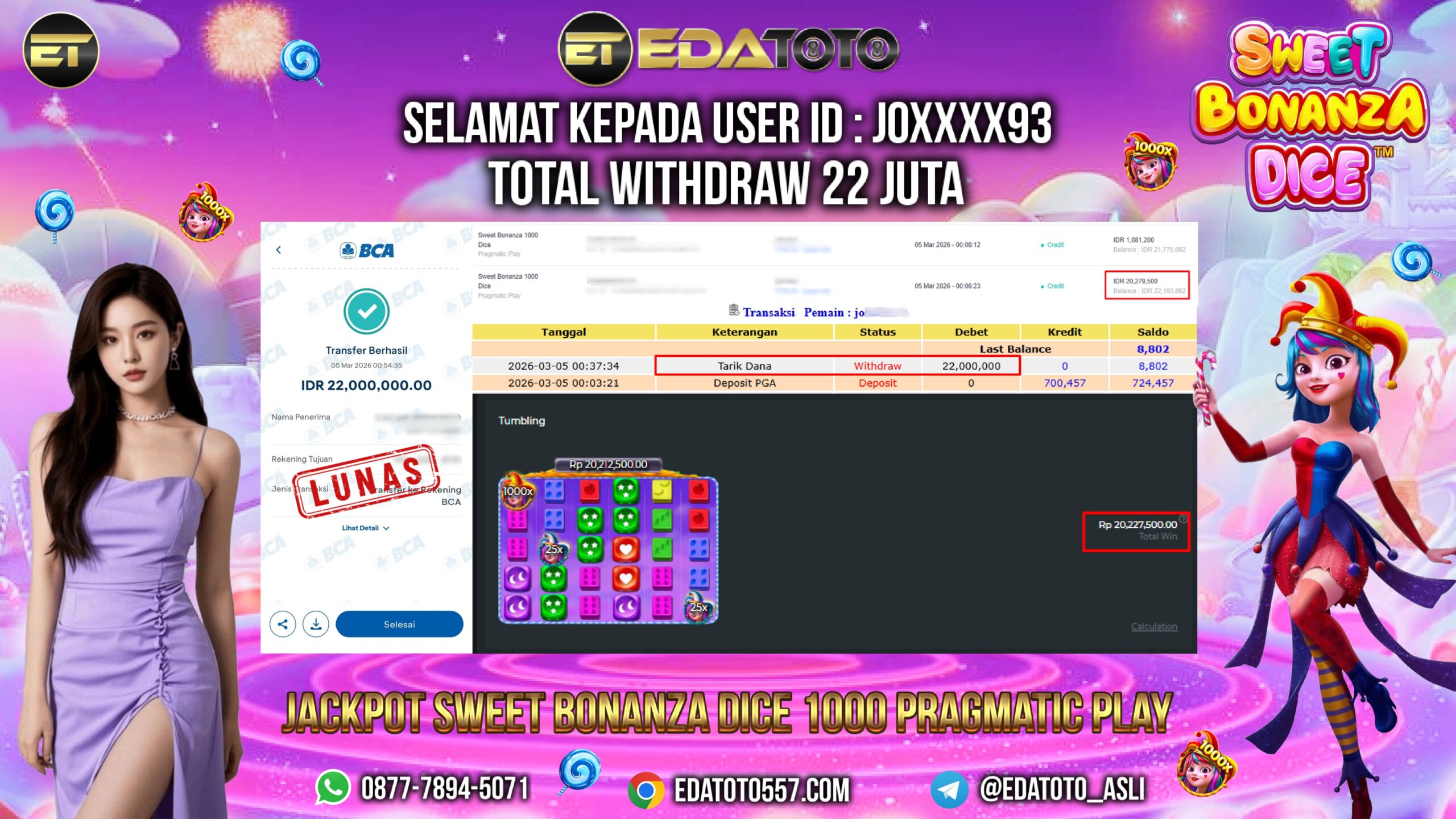 Selamat Kepada Pemilik user ID :JO****93 Hari/Tanggal : Kamis / 05 MARET 2026 Jackpot : Rp, 20,227,500 JT Withdraw : . . .