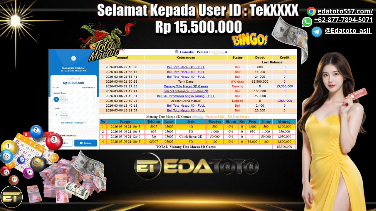 Selamat Kepada Pemilik user ID :Tek**** Hari/Tanggal : Jumat / 06 MARET 2026 Jackpot : Rp, 15,300,000 JT Withdraw : . . .