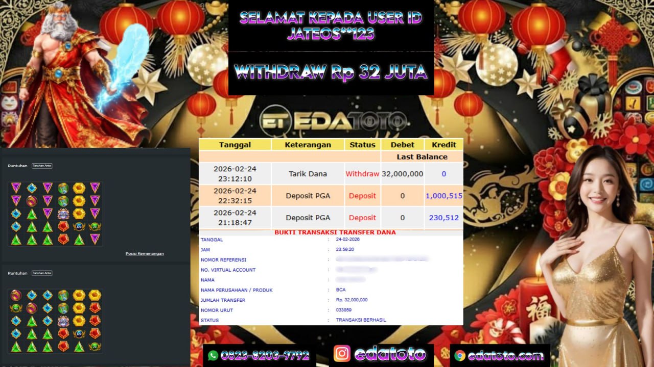 Selamat Kepada Pemilik user ID : Jateos**123 Hari/Tanggal : Selasa / 24 februari 2026 Jackpot : Rp, 32,622,000 JT Withdraw . . .