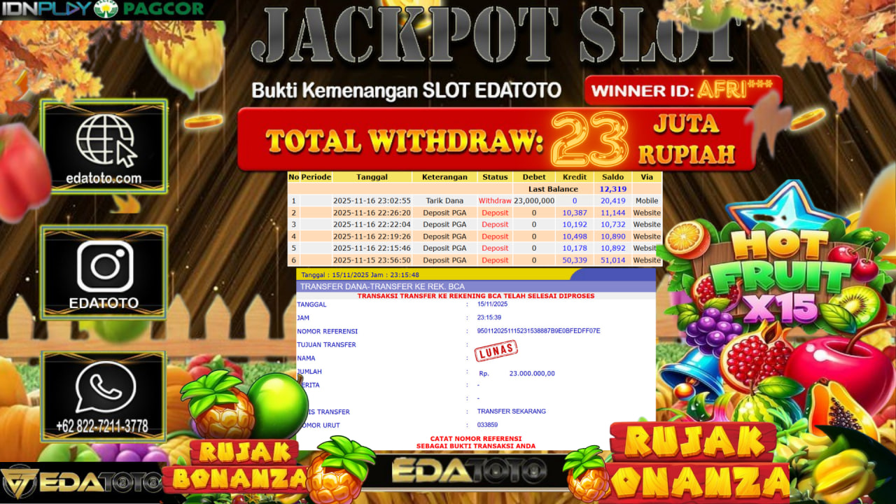 Selamat Kepada Pemilik user ID : AFRI*** Hari/Tanggal : Jumat / 14, November 2025 Jackpot : Rp. 24,580,000 JT Withdraw . . .